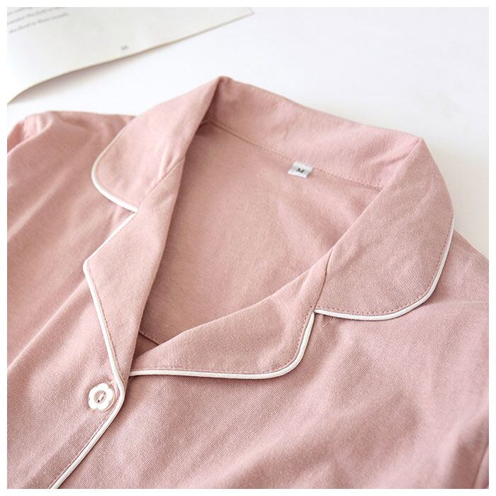 ・シンプルな無地カラーに、襟元や袖、裾などに入ったホワイトラインがアクセント♪さらにトップスのボタンが、花型になっているのもポイント。