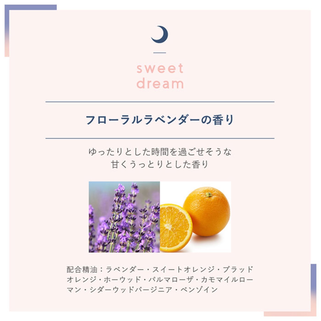 ・スイートドリーム…ゆったりとした時間を過ごせそうな甘くうっとりとした、フローラルラベンダーの香り。