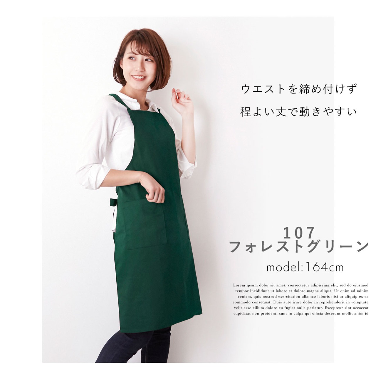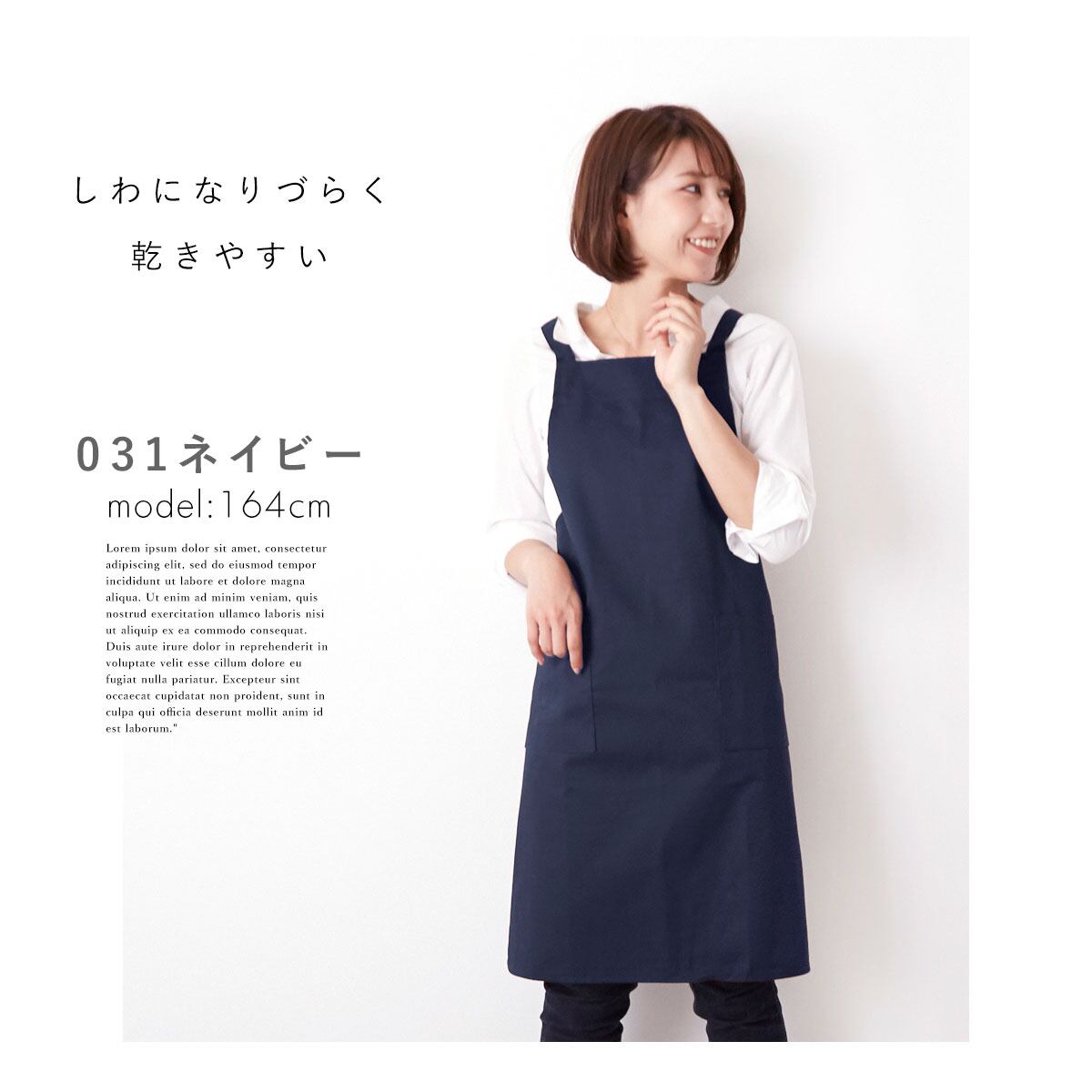 長時間着用しても肩が凝りにくい、X型の肩掛け型です。また生地は、繊維密度が高いツイル生地を使用しています。厚みがあるので、水はねや油はねも下の服まで染みない作りになっています。ポリエステルと綿の混紡で型崩れを起こしにくく、吸湿性も低いため、しわになりづらく、乾きやすいのもポイントです。また、便利な大きめポケットが付いていて、両端にステッチ加工を追加しているので、ほつれにくく耐久性がUP!へたりにくいのも嬉しいですね。