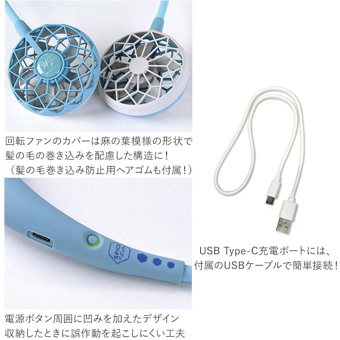※ファンの裏側から髪の毛が入り込む恐れがあります。髪の毛の巻き込みには十分ご注意ください。(対策のひとつとしてヘアゴムを付属していますので、ご自身のヘアゴムと合わせてご利用ください。)