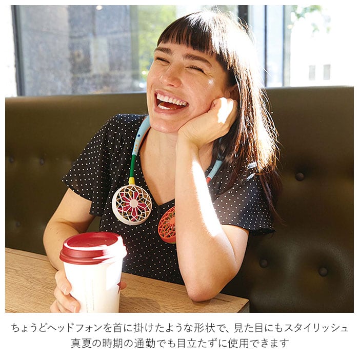 ・ちょうどヘッドフォンを首に掛けたような形状で、見た目にもスタイリッシュ。真夏の時期の通勤でも目立たずに使用できる。