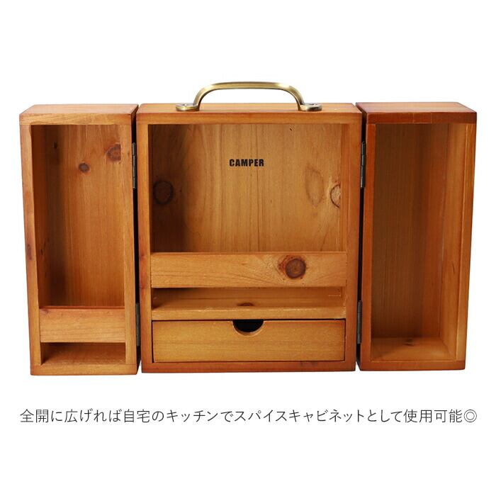 ・全開に広げれば自宅のキッチンでスパイスキャビネットとして使えて、キャンプなどのアウトドア時にはそのまま持ち出せる♪