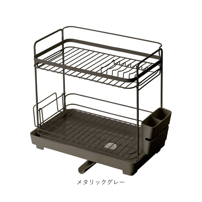 ・水切りカゴ本体は、大きめのお皿もすっきりと並べやすいワイヤー形状を採用。スリム設計の2段式タイプで、場所を取らないのに大容量の洗い物も安心!