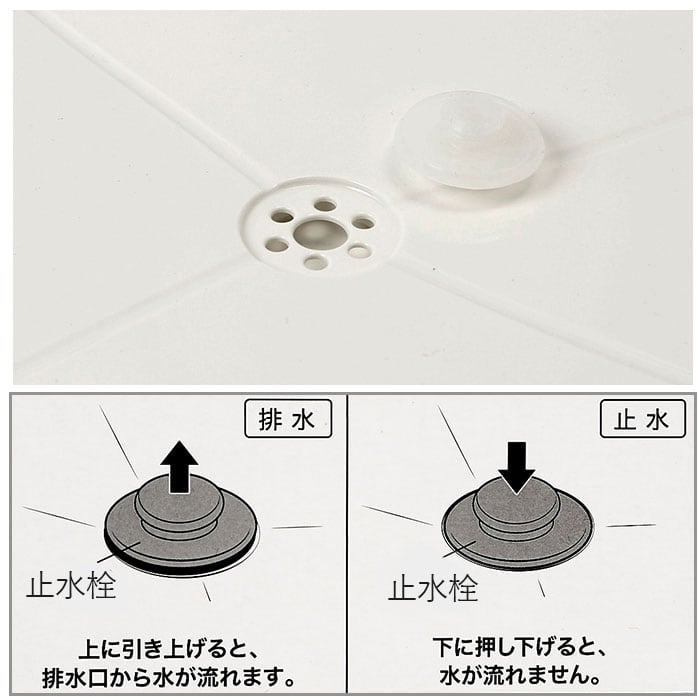 ・傾斜のついた底面トレーが水を中央の排水穴に集めるため、水が溜まらず衛生的。(※排水栓は、排水・止水の切り替えが可能)