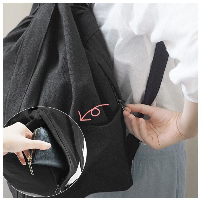 ・背負ったまま開閉できるファスナーポケットが背面に付属しているのでお財布やスマホ等の貴重品をいれるのに最適。