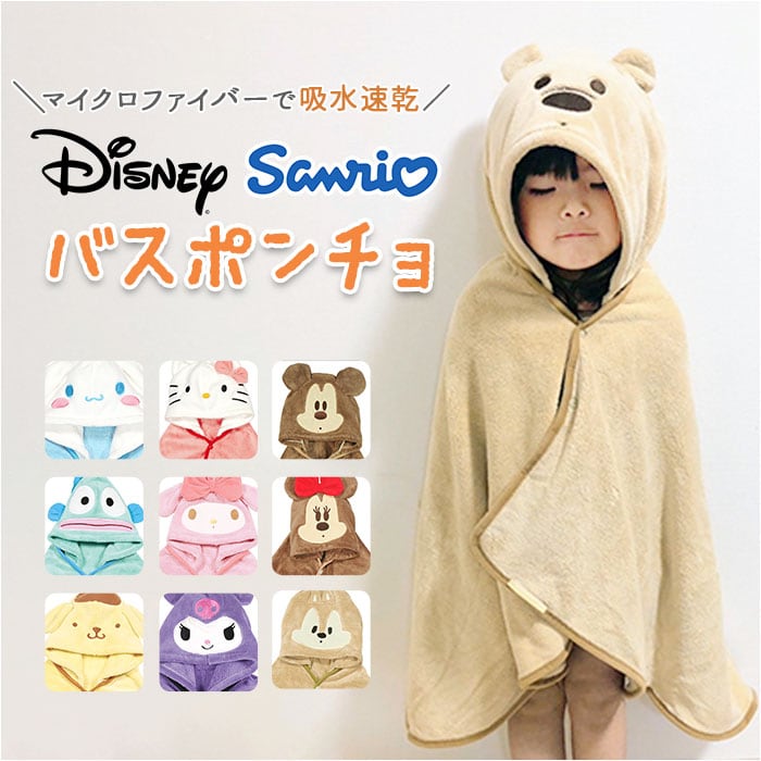 ・パっと被るだけで身体や髪の水分を素早く吸収♪人気キャラクターの「吸水速乾フード付きバスポンチョ」が登場。