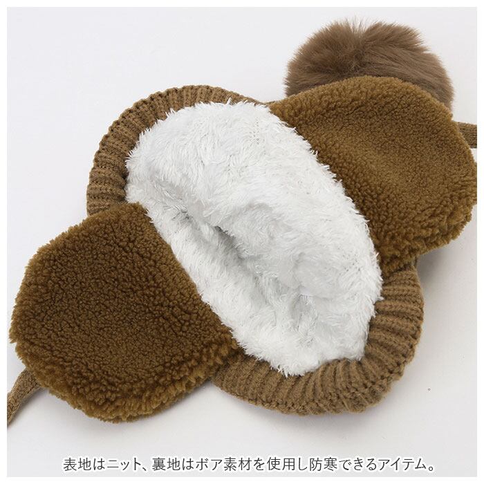 ・もこもこ素材でできた耳当ても縫い付けており、頭と耳を冷気からしっかりカバー。