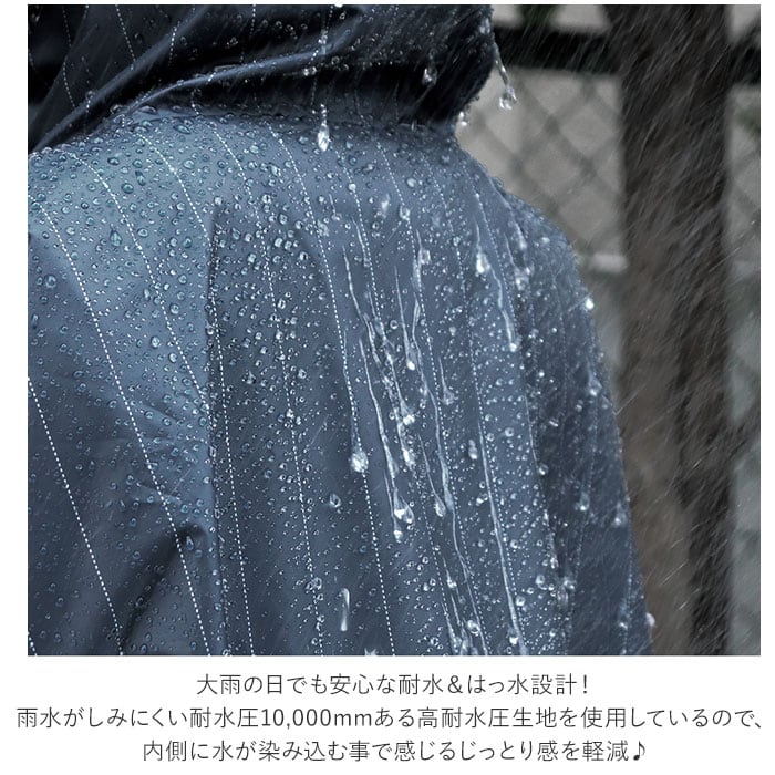 ・大雨の日でも安心な耐水&はっ水設計!雨水がしみにくい耐水圧10,000mmある高耐水圧生地を使用しているので、水が染み込む事で感じるじっとり感を軽減♪