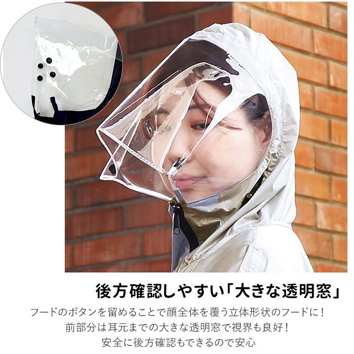 ・ボタンを留めることで顔全体を覆う立体形状のフード。前部分は耳元までの大きな透明窓で視界も良好!安全に後方確認もできるので安心。