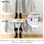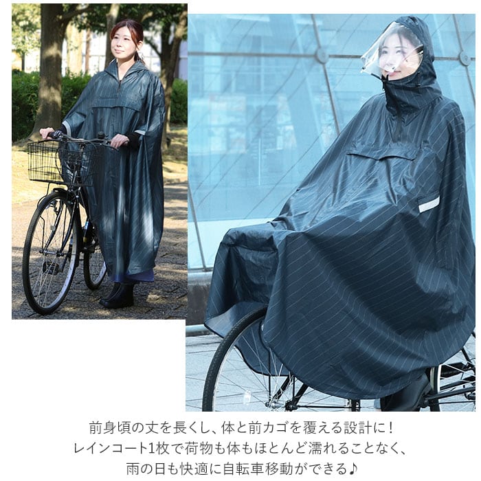 ・前身頃の丈を長くし、体と前カゴを覆える設計に!レインコート1枚で荷物も体もほとんど濡れることなく、雨の日も快適に自転車移動ができる♪