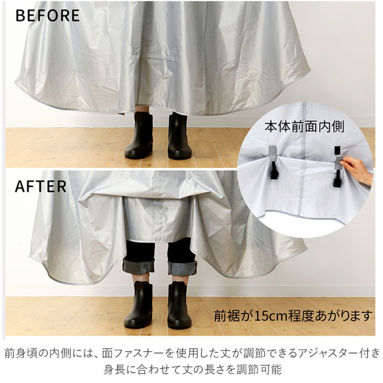 ・前身頃の内側には、面ファスナーを使用した丈が調節できるアジャスター付き。身長に合わせて丈の長さを調節可能。
