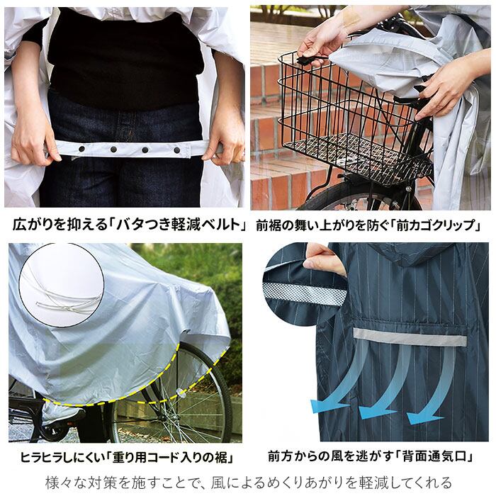 ・風が吹いてもめくり上がりにくい3つのこだわりポイント♪内側腹部前で留める「バタつき軽減ベルト」、前カゴに留める「クリップ」、ヒラヒラとめくれがちな裾には「重り」になるチューブを入れ、背面には「通気口」を設置。