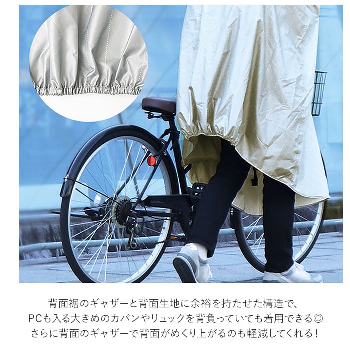 ・リュックも背負ったまま着られるゆったり構造!背面裾のギャザーと背面生地に余裕を持たせ、PCも入る大きめのカバンを背負っていても着用できる◎