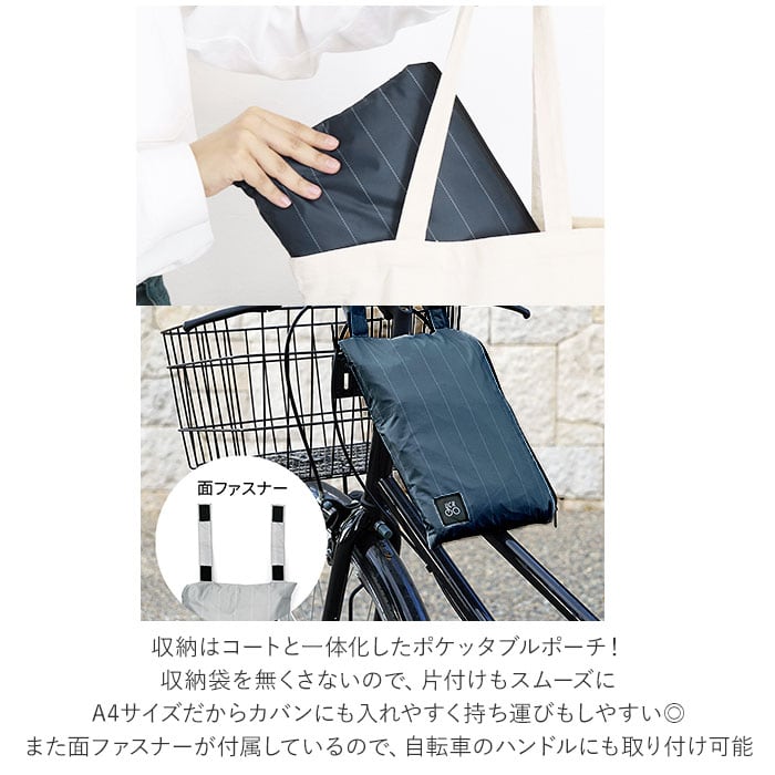 ・収納袋はコートと一体化したポケッタブルポーチ!片付けもスムーズにできカバンに入れやすいA4サイズ。面ファスナーも付属しているので、自転車のハンドルにも取り付けができ、持ち運びもしやすい◎