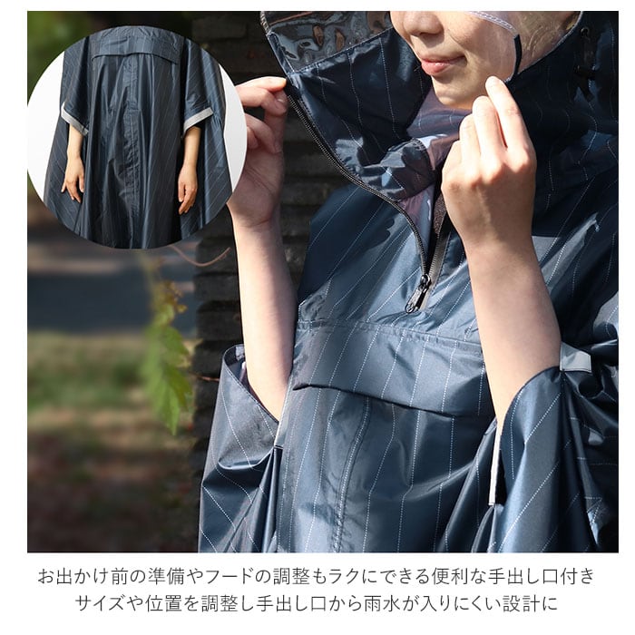 ・お出かけ前の準備やフードの調整もラクにできる便利な手出し口付き。サイズや位置を調整し手出し口から雨水が入りにくい設計に。