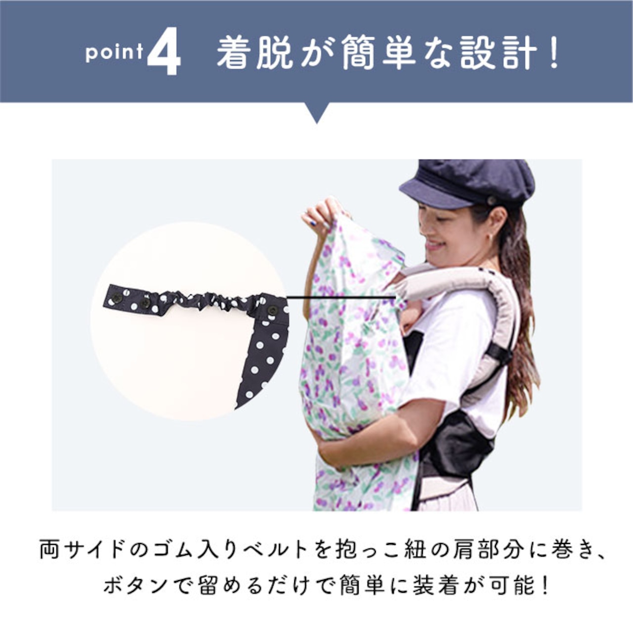 ・スナップボタンのついたゴム入りベルトが付属しているので、お手持ちの抱っこ紐に簡単に装着ができる。さらに、スナップボタンは2段階に調節ができ、ベルトも伸縮自在。
