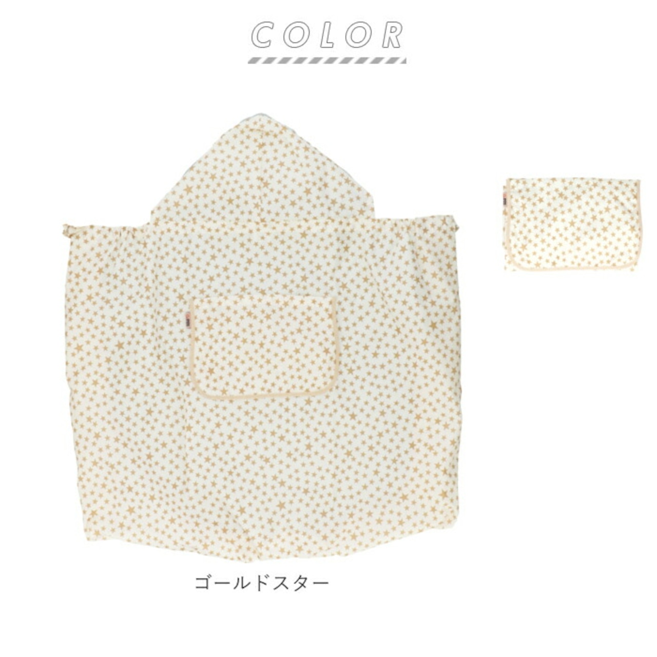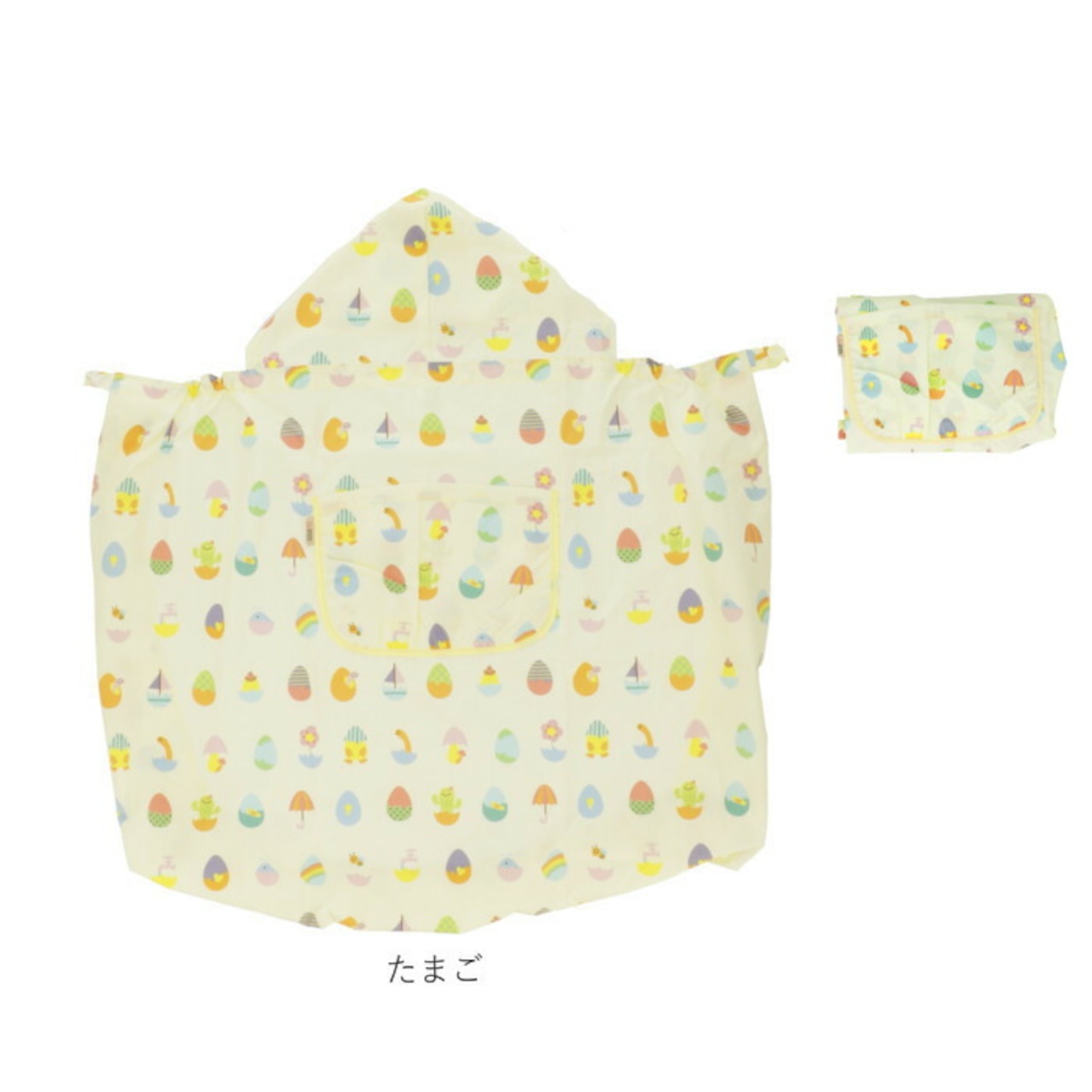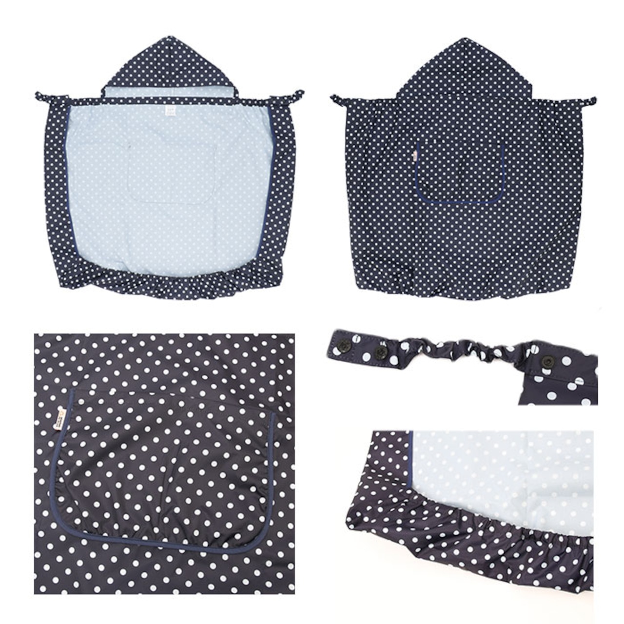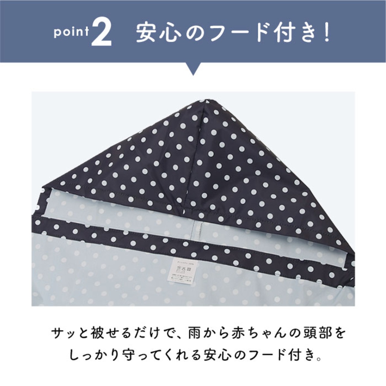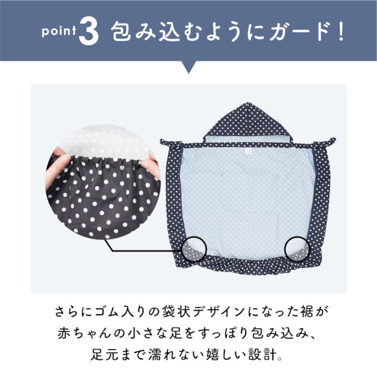 ・雨から頭部を守ってくれる安心のフード付き。さらにゴム入りの袋状デザインになった裾が赤ちゃんの小さな足をすっぽり包んでくれて足元まで濡れない嬉しい設計。