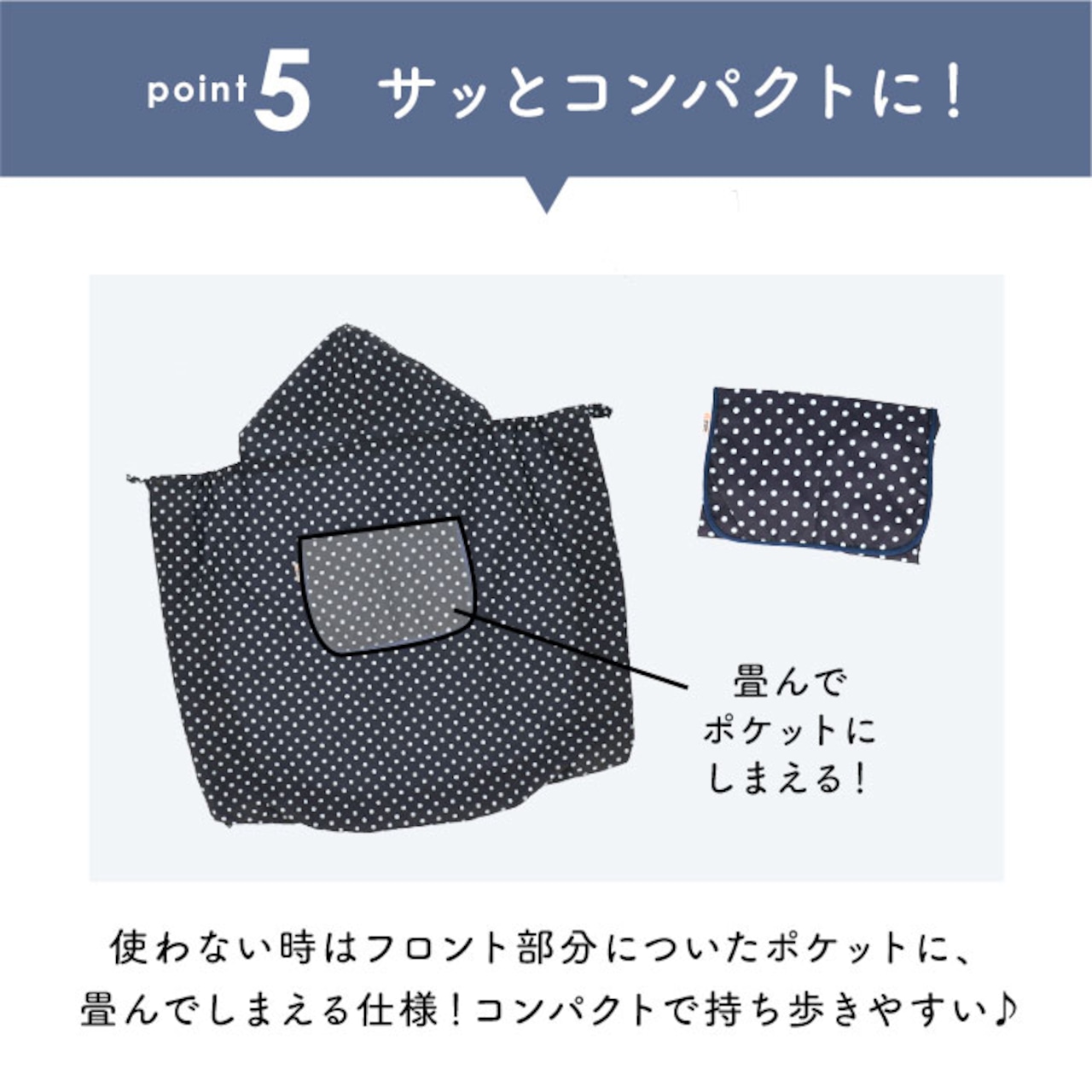 ・レインカバーのフロントに付いたオープンポケットは、使用しない時に畳んでポケット内にしまえる仕様。コンパクトに畳めてかさばりにくく持ち運びも楽チン。