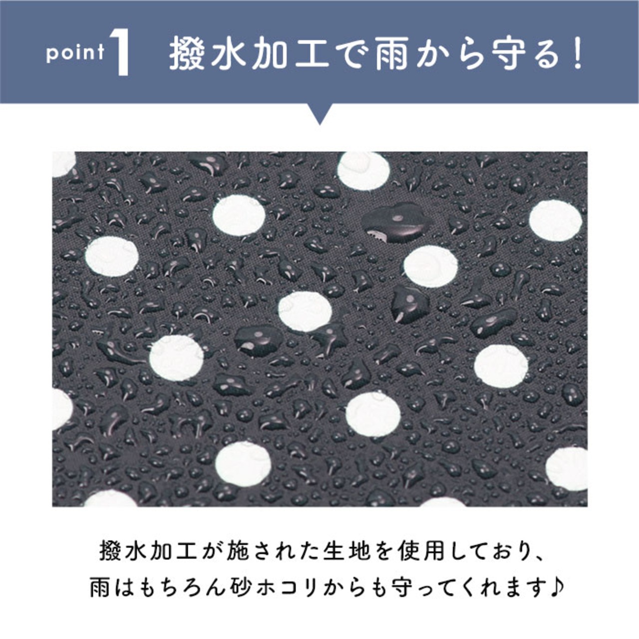 ・撥水加工が施された生地を使用しているから、雨はもちろん砂ホコリからも守ってくれる便利なアイテム。