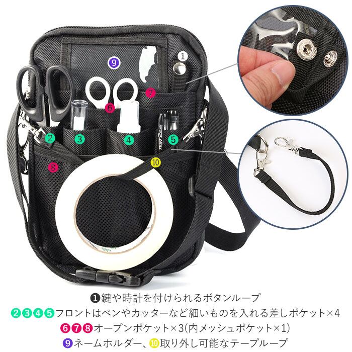 ・フロントはペンやカッターなど細いものを入れる差しポケット×4、オープンポケット×3(内メッシュポケット×1)、ネームホルダー、取り外し可能なテープループ、鍵や時計を付けられるボタンループ。