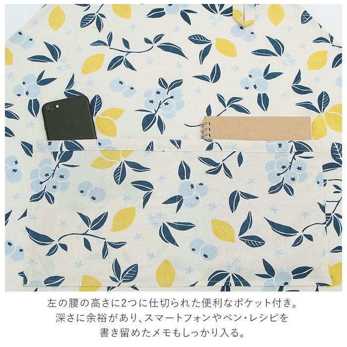 ・左の腰の高さに2つに仕切られた便利なポケット付き。深さに余裕があり、スマートフォンやペン、レシピを書き留めたメモもしっかり入る。