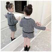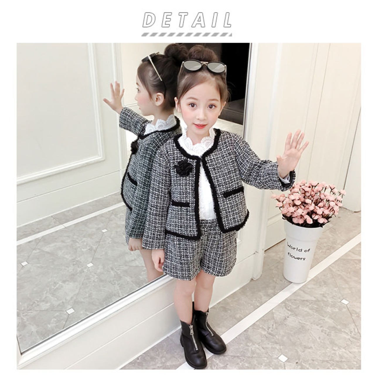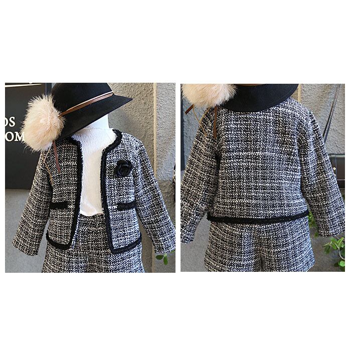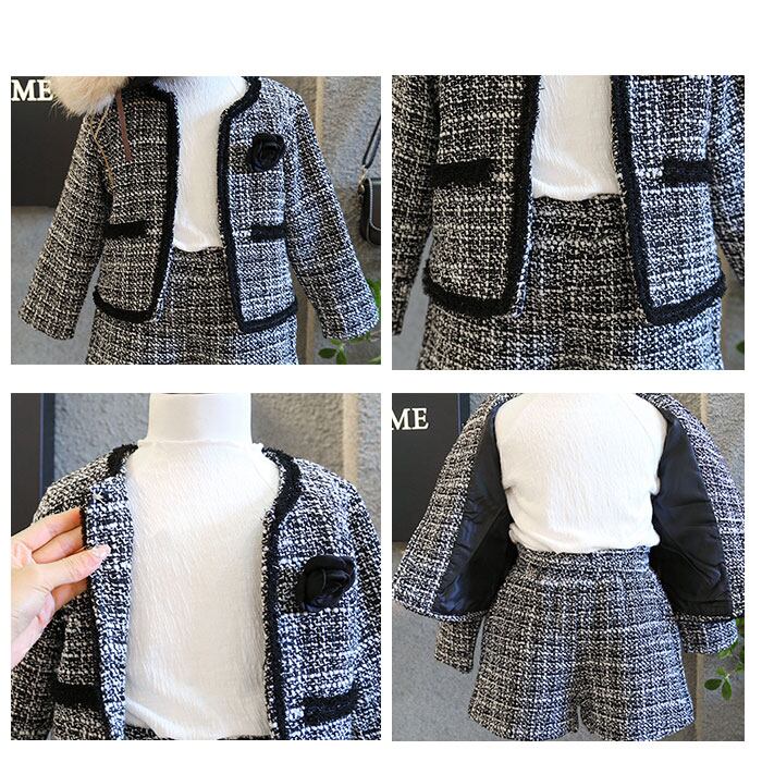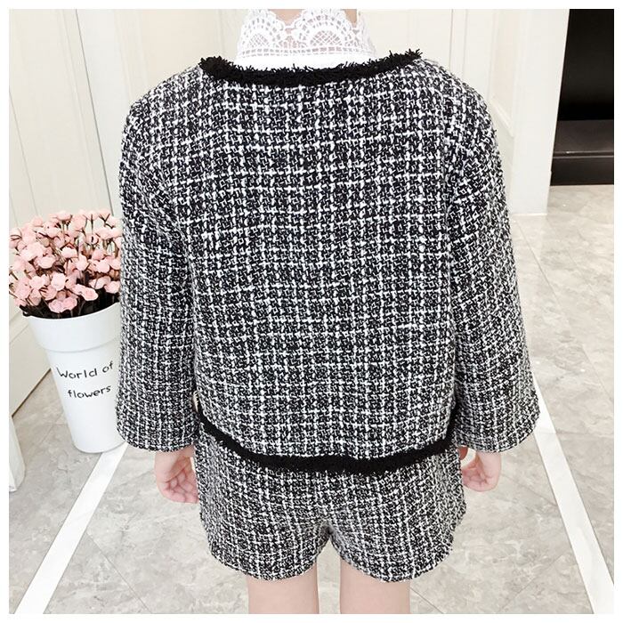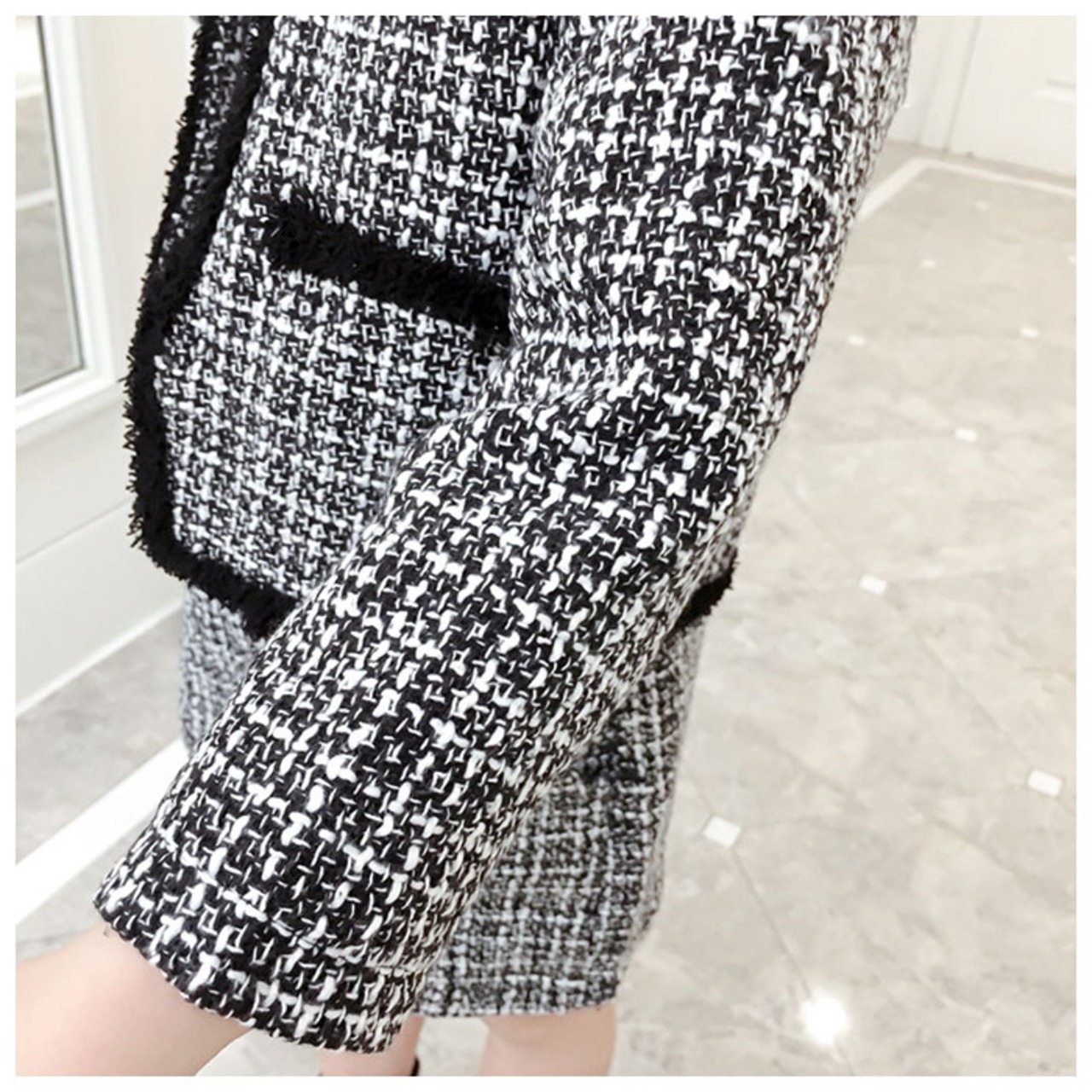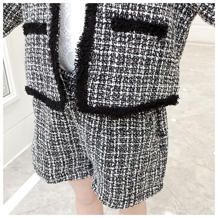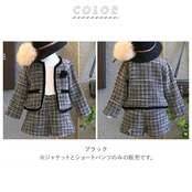 ・厚手のしっかりとした生地感で、ツイードデザインがおしゃれなジャケットとショートパンツのセット。