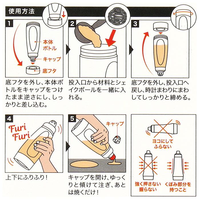 ・ボトルに材料を入れ付属のシェイクボールを投入、上下にフリフリして混ぜたら直接流して焼くだけ♪小さなお子様でもカンタンに調理ができる。