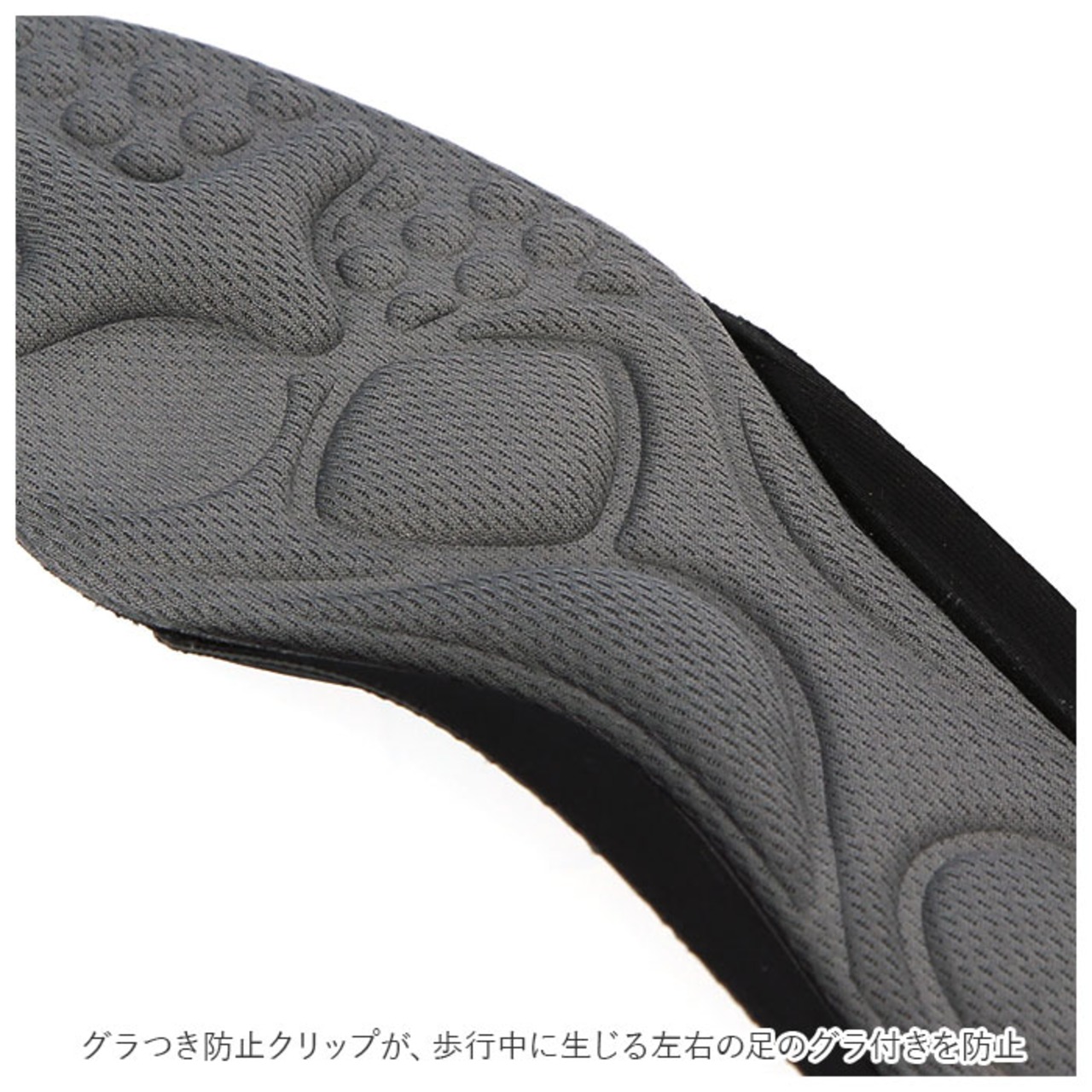 ・グラつき防止クリップが、歩行中に生じる左右の足のグラ付きを防止。