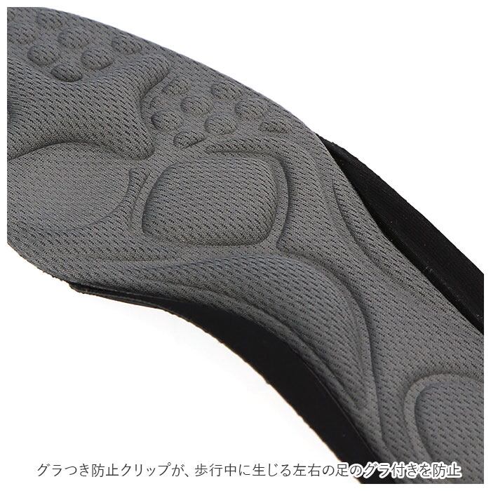 ・歩行時の足の前滑りを防止する母趾球ホール、歩行時の足の痛みや疲れを緩和する土踏まずサポート、親指のズレを防ぐストッパー機能を搭載。