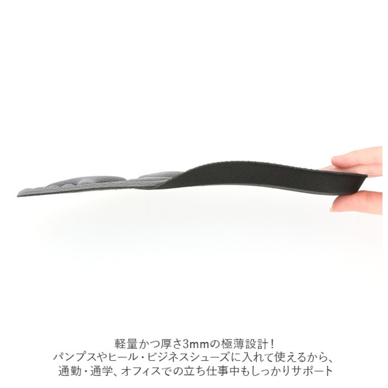 ・軽量かつ厚さ3mmの極薄設計!パンプスやヒール・ビジネスシューズに入れて使えるから、通勤・通学、オフィスでの立ち仕事中もしっかりサポート。