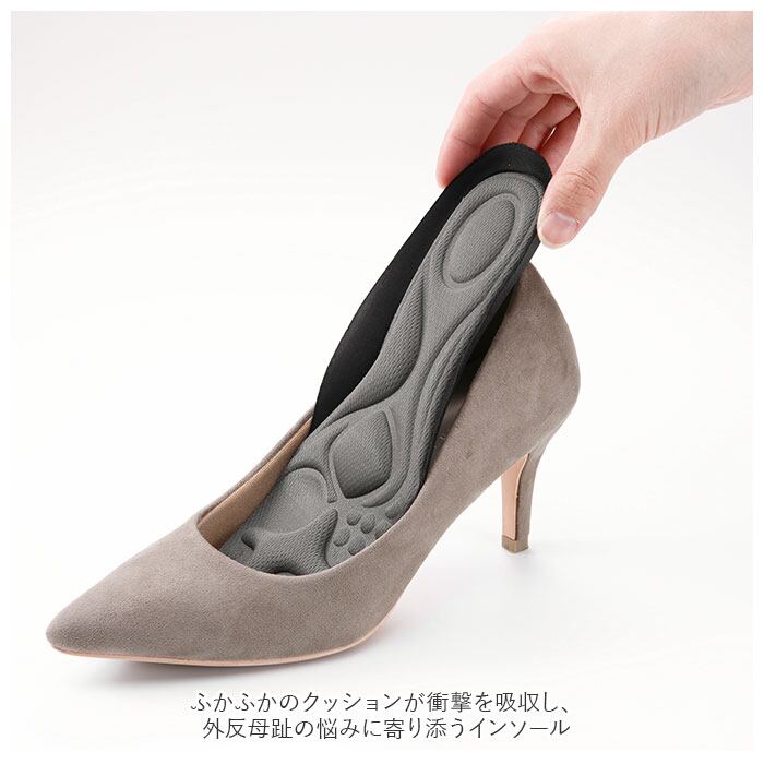 ・ふかふかのクッションが衝撃を吸収し、外反母趾の悩みに寄り添うインソール。足の形にフィットするから歩きやすく、長時間歩いても足が痛くなりにくい◎
