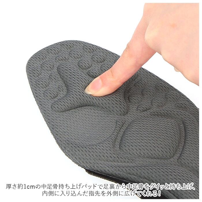 ・厚さ約1cmの中足骨持ち上げパッドで足裏から中足骨をグイッと持ち上げ、内側に入り込んだ指先を外側に広げてくれる!