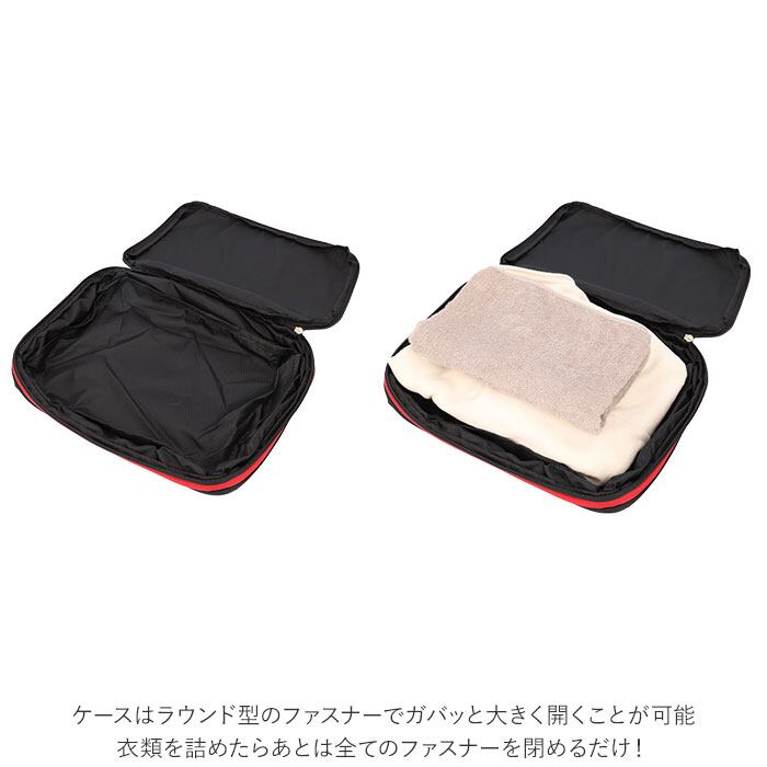 ・ケースはラウンド型のファスナーでガバッと大きく開くことが可能。衣類を詰めたらあとは全てのファスナーを閉めるだけ!