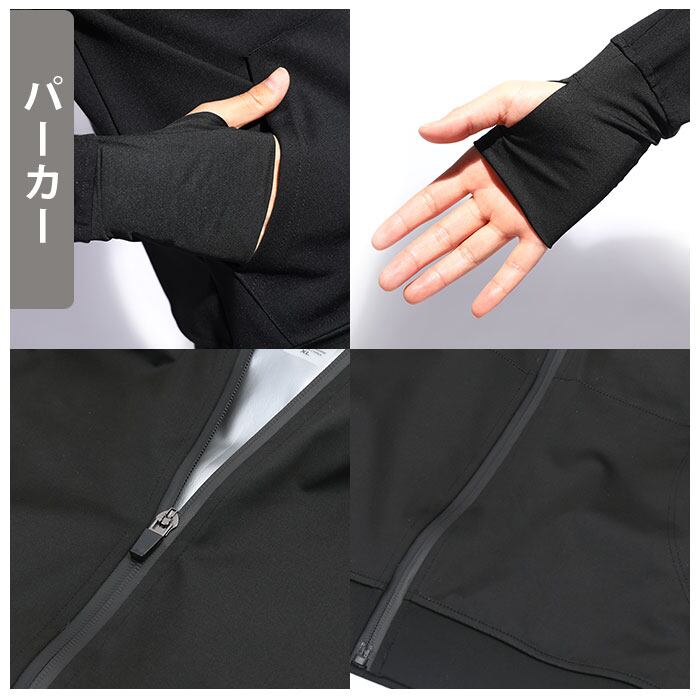 ・ボトムスとパーカーには裏地にアルミニウムコーティングが施されており、体の熱を閉じ込め保温性あり◎汗をかきやすくなり通常の運動以上のシェイプアップ効果が見込める。