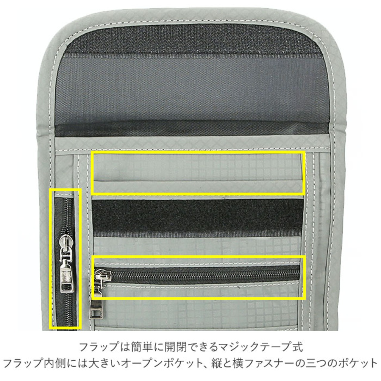 ・フラップは簡単に開閉できるマジックテープ式。フラップ内側には大小二つのオープンポケットを装備。