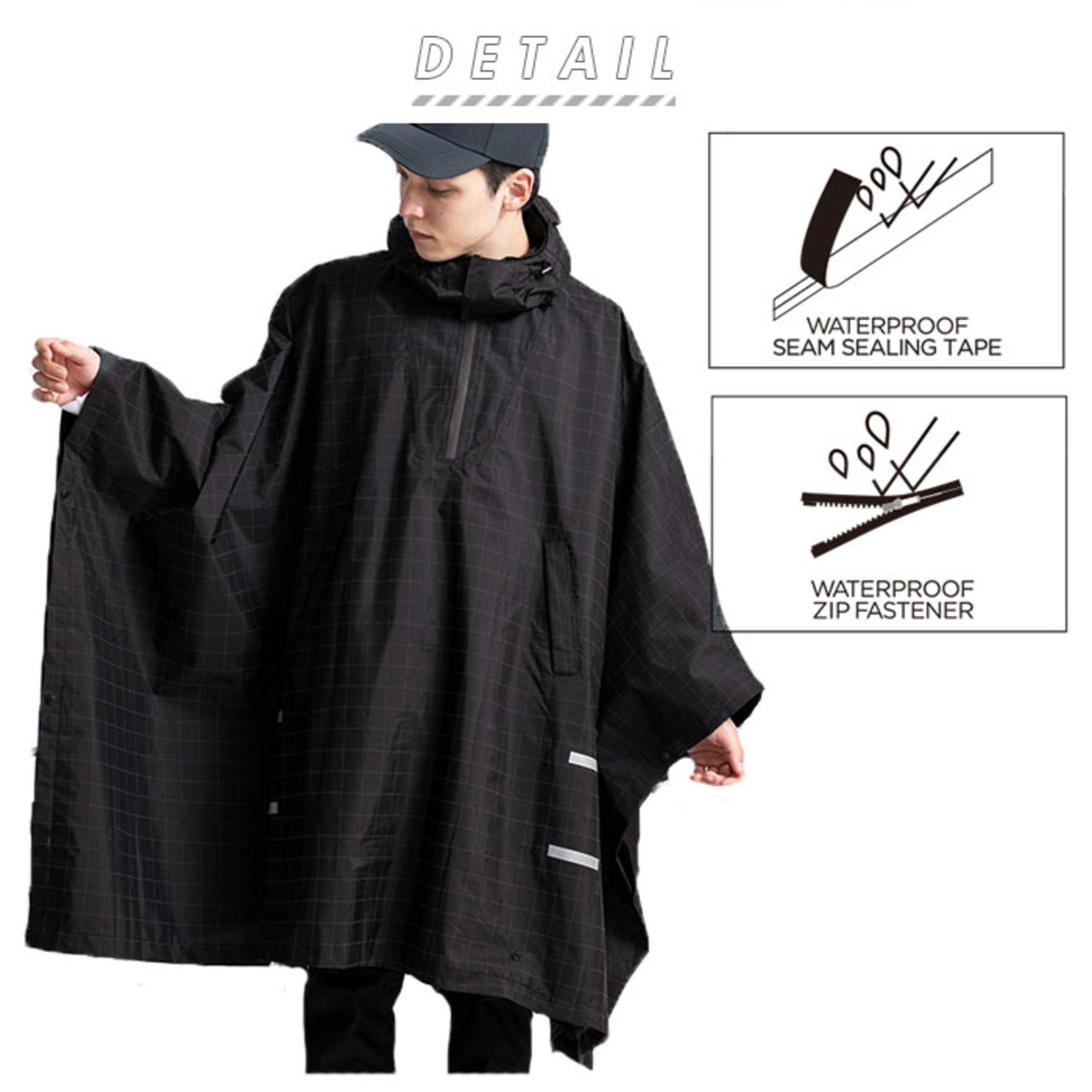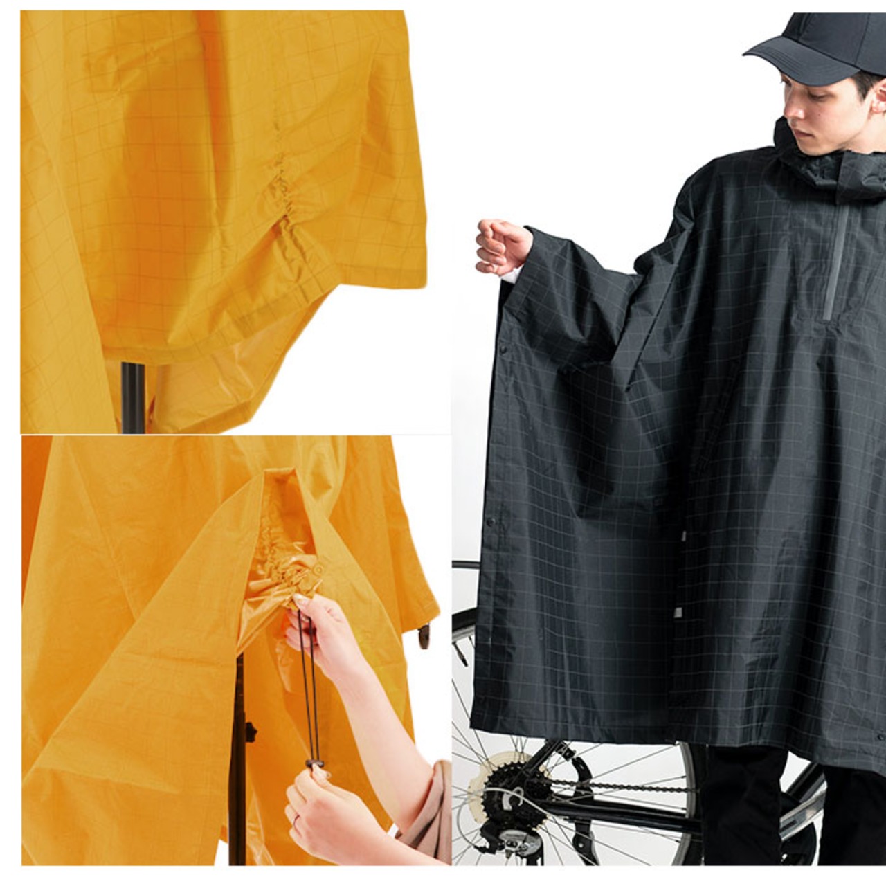 ・ポンチョ背面生地裏部分に配置されたドローコードで、裾の長さを調整可能。後輪の巻き込みを防いでくれる。