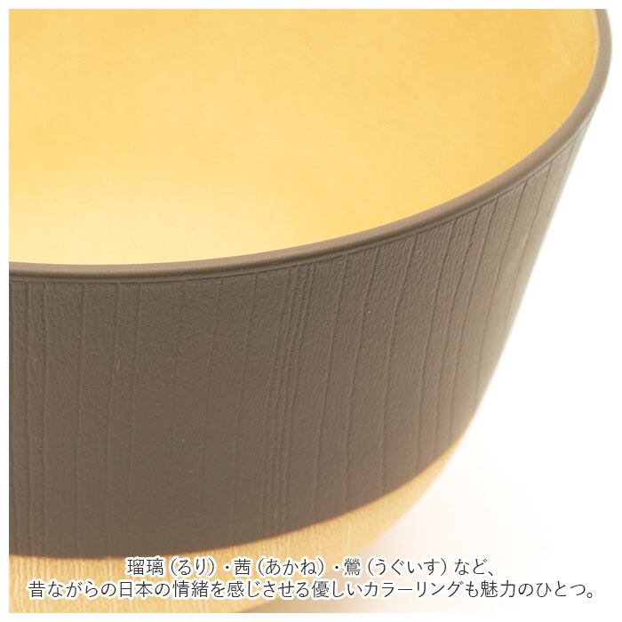 「やさしい彩り」シリーズは、明るい木目調の樹脂素材を日本古来の風雅な色彩で仕上げた和食にも洋食にも映えるテーブルウェア。