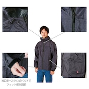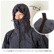 ・フードは背面のベルクロ式(マジックテープ)ベルトで深さを調節可能。さらに、袖口もベルクロ式ベルトでフィット感を調節できて、しっかり雨の侵入を防ぐ。
