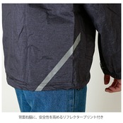 ・背面右脇に、安全性を高めるリフレクタープリント付き。薄暗い雨の日でも、背後からすれ違う車から認識されやすくなり、安心して着用できる。