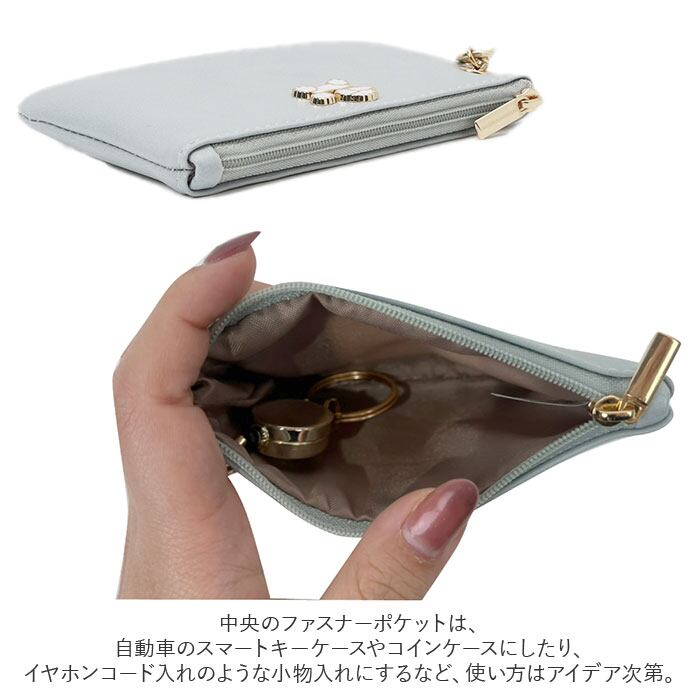 ・中央のファスナーポケットは、自動車のスマートキーケースやコインケースにしたり、イヤホンコード入れのような小物入れにするなど、使い方はアイデア次第で無限大。