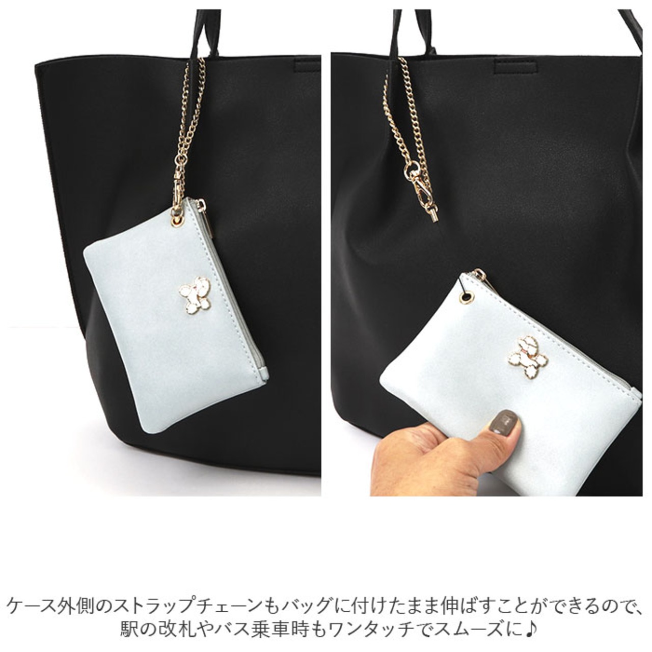 ・ケース外側のストラップチェーンもバッグ付けたまま伸ばすことができるので、駅の改札やバス乗車時もワンタッチでスムーズに♪