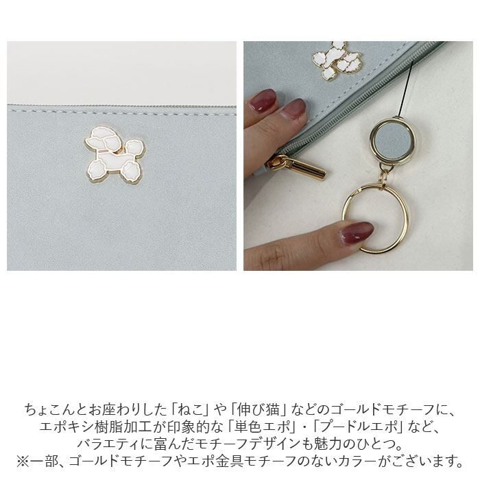 ・ちょこんとお座わりした「ねこ」や「伸び猫」などのゴールドモチーフに、ぷっくりとしたエポキシ樹脂加工が印象的な「単色エポ」・「プードルエポ」など、バラエティに富んだモチーフデザインも魅力のひとつ。(※一部、ゴールドモチーフやエポ金具モチーフのないデザインのカラーがございます。)