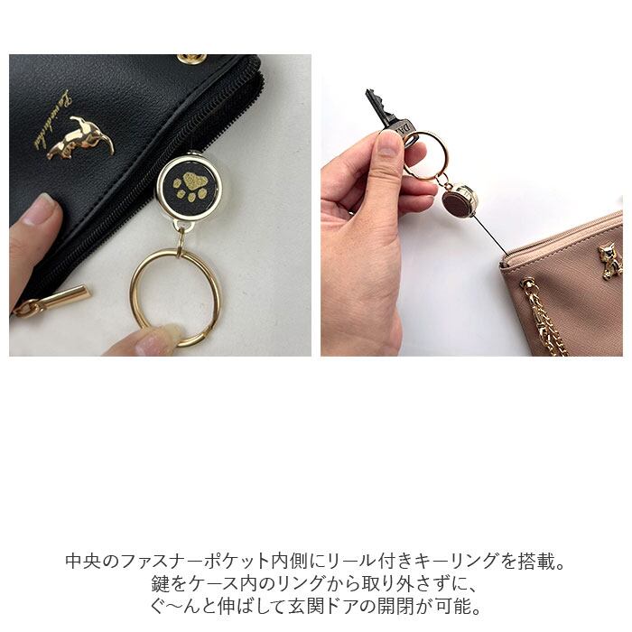 ・中央のファスナーポケット内側にリール付きキーリングを搭載。鍵をケース内のリングから取り外さずに、ぐ〜んと伸ばして玄関ドアの開閉が可能。