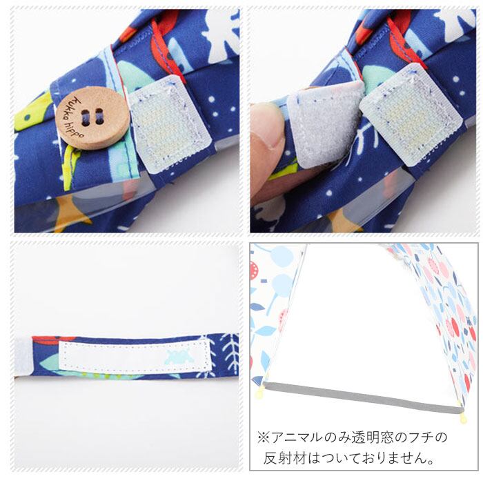 雨の日が楽しくなるような、おしゃれでかわいい子供用の傘です♪前が見えやすいように、1コマだけ透明窓になっています。夜など暗い場所でライトが当たると光を反射してカバさんが光ります♪傘を留めるネームバンドは、お子さまでも留めやすい太めタイプのベルクロつき。男の子・女の子どちらもお使いいただける柄・色バリエーションです。