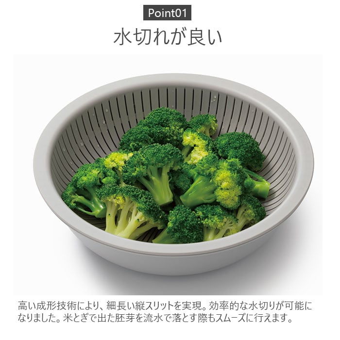 ・ザル側面に配した縦スリットで水切れが良く、お米を逃さず、ヌカや余分な胚芽をサッと流し落とすことが可能。