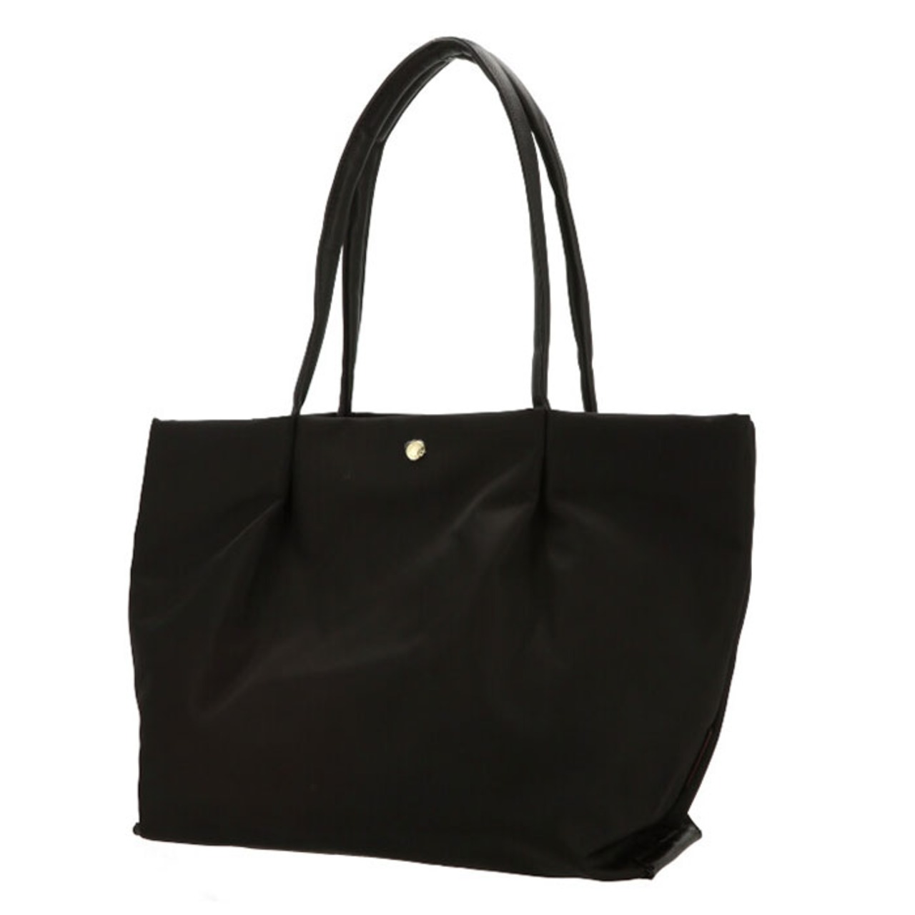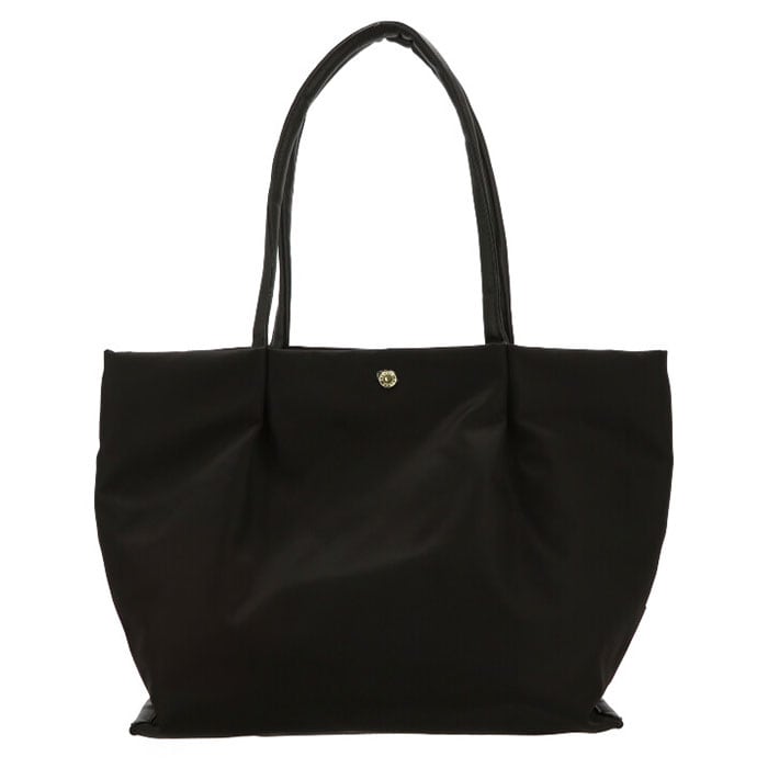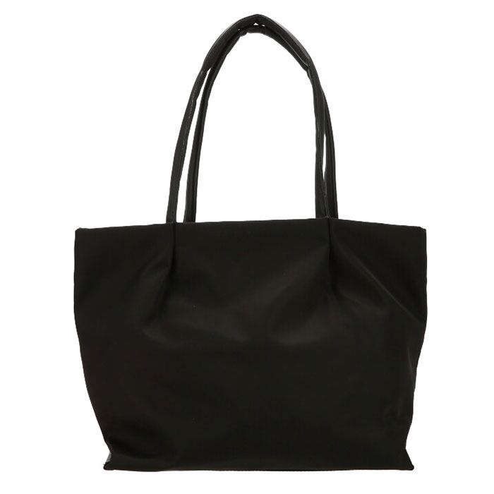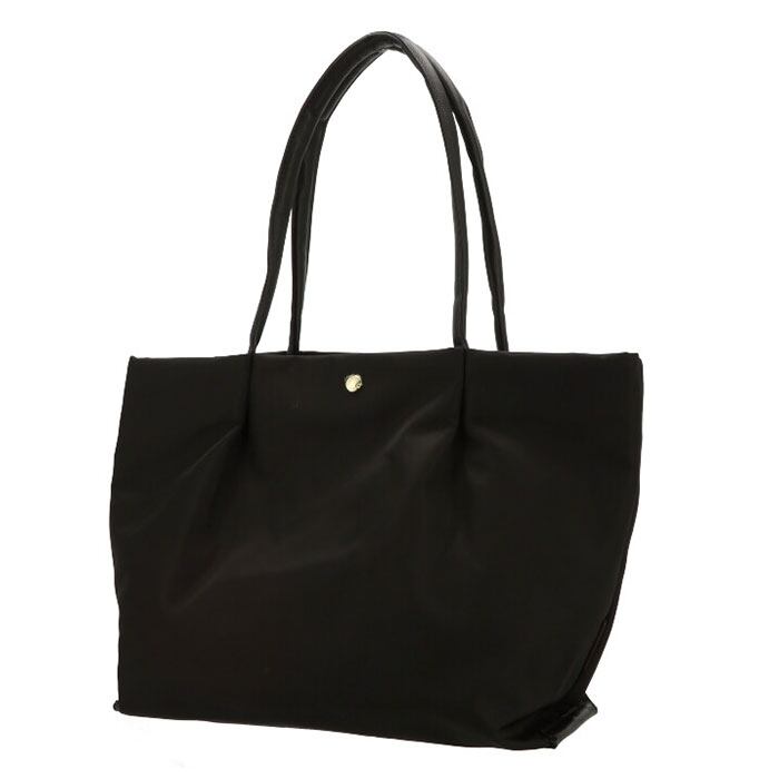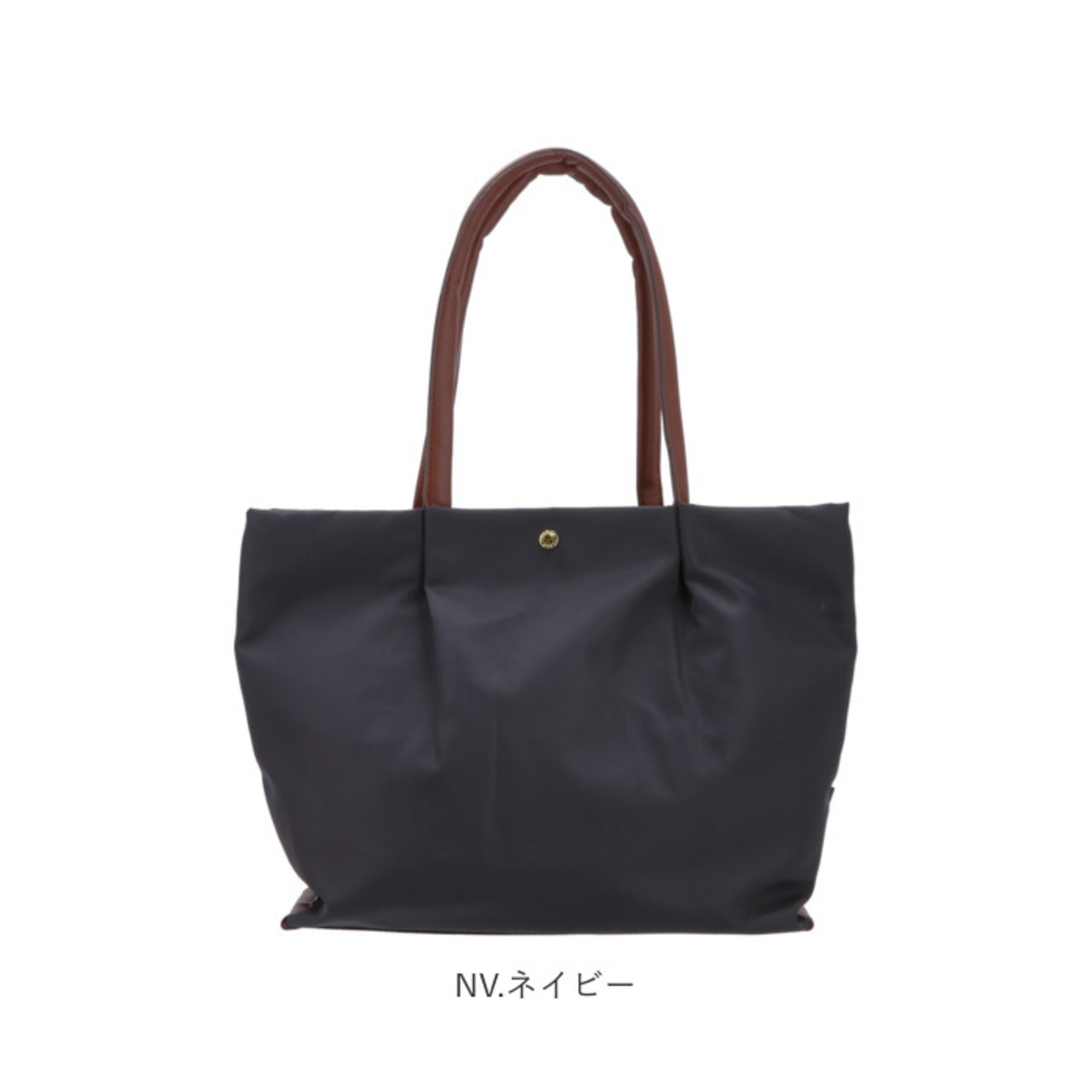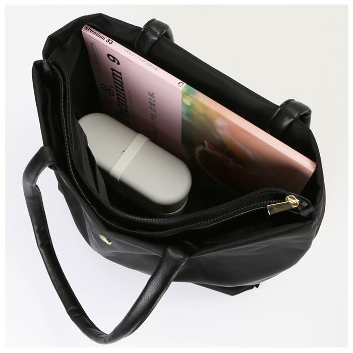 ・艶やかな光沢を放つナイロン素材と、ゴールドの金具使いのコンビネーションが女性らしさを引き立てる、シンプルなトートバッグ。