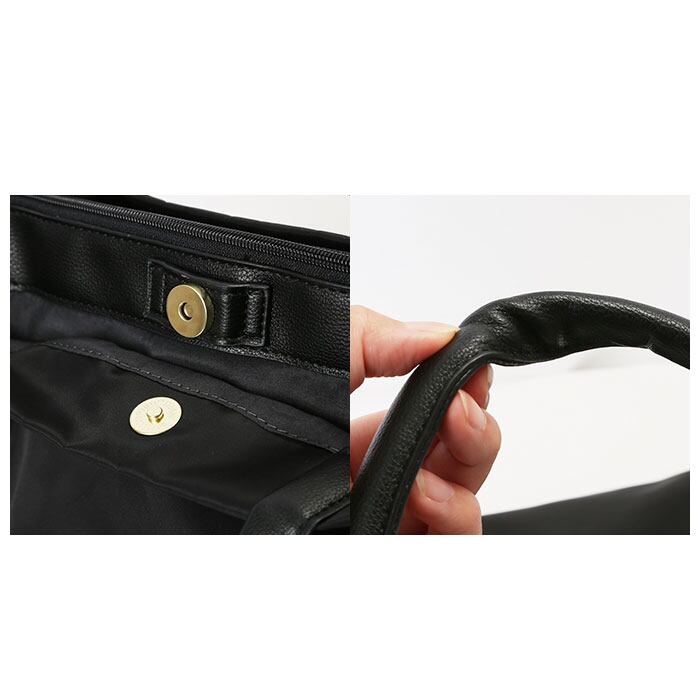 ・持ち手ハンドルには柔らかな合皮素材にクッション素材を縫い込んであるため、肩に負担を感じにくい優しい仕上がり。