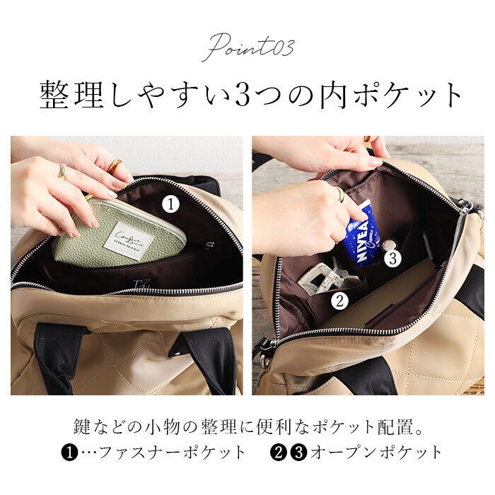 ・キルティング加工を施した、光沢感のあるナイロン生地を採用。水や汚れをサッと弾く撥水生地でお手入れがラクチン。(※完全防水ではありません。)