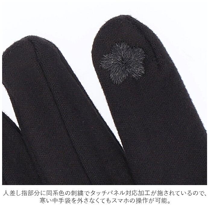 ・人差し指部分に同系色の刺繍でタッチパネル対応加工が施されているので、寒い中手袋を外さなくてもスマホの操作が可能。