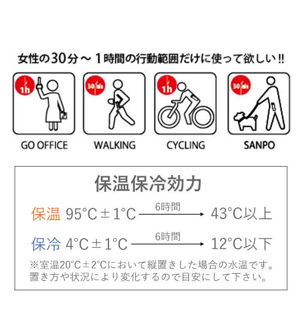 ※保冷効力とは、室温20度±2度において、4度±1度の水を実容量分入れ縦置きした状態で6時間放置した場合におけるその水の温度。